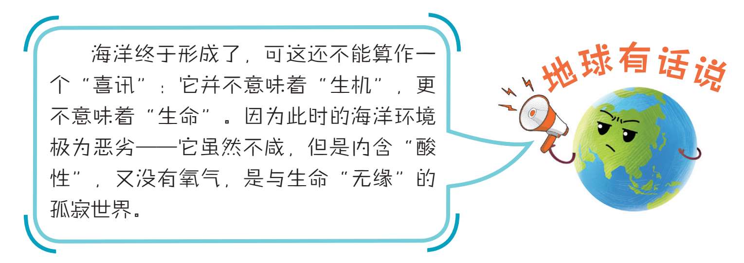 46亿年前,地球初成。它躁动不安,时刻都在显示自己的力量。原始地壳薄脆而无力,根本没办法束缚住里面炽热而冲动的熔岩,再加上随时造访地球的小天体的撞击,火山、地震像比赛似的,争相爆发。它们把藏在地底下的水喷出地表,又汇聚到天空上,形成原始大气。那藏在地底下的水是宇宙的馈赠。每一次火山喷发,地球上空都会增加几百万千克的水蒸气。水汽日复一日喷发、堆积,渐渐形成云朵。当地球开始降温,云朵中又容纳不下那么多的水汽时,大雨便倾盆落下。