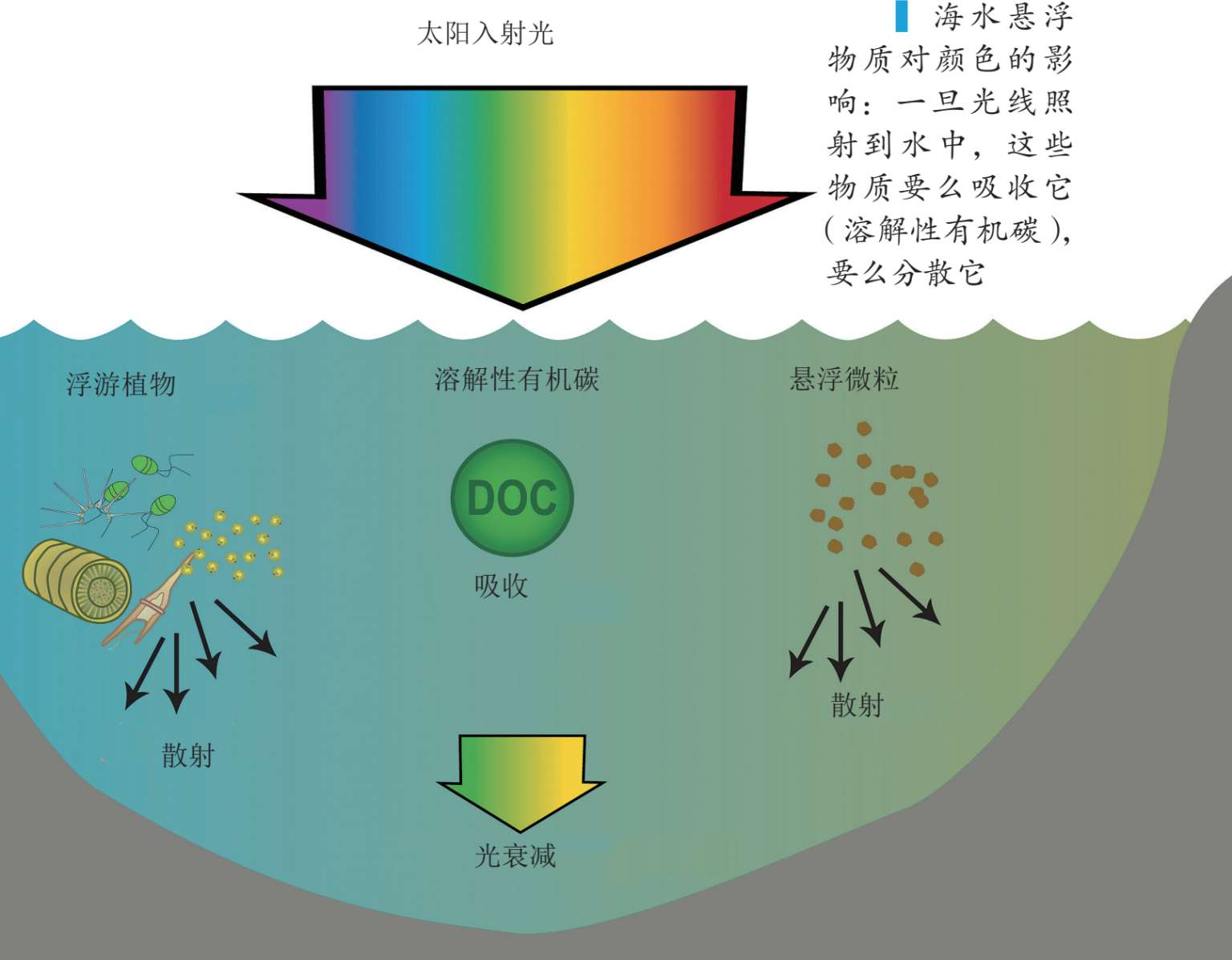 海水中的悬浮物质也会影响到海水的颜色。离海岸近的海水悬浮物质多,颗粒很大,这使得远处与近处的海水颜色有了很明显的区别。远处的海水颜色深蓝,近处的则慢慢变浅。到了河口三角洲附近,海水受陆地影响很大,颜色多呈现淡绿色。