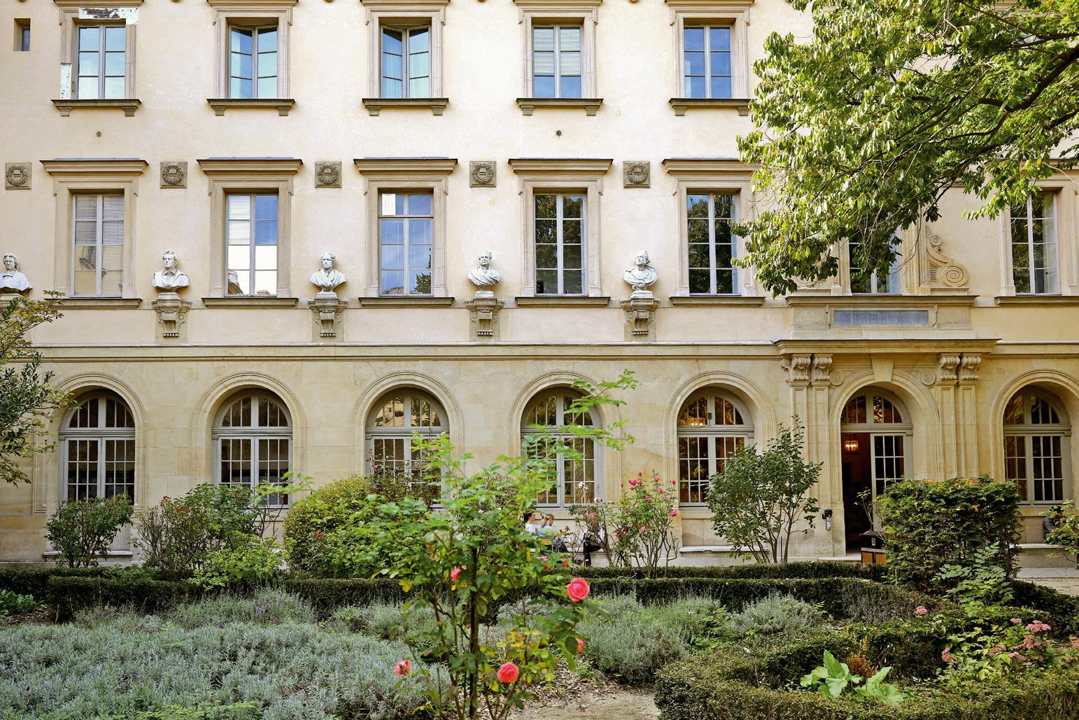 进入巴黎高等师范学院的校园,我们才确切感觉到它的“袖珍”:主楼门上有两尊女神雕像,分别象征着文学和科学;侧门进入门岗室,接受安全检查后就可以直接迈入大门;大厅里有一座被称为“水族馆”的收发室,后来被改建为公共电话亭,是师生们对外联系的窗口;穿过大厅,中庭花园有个水池,池边桌子是学生们喜欢的学习场所之一;穿过花园进入二进院是图书馆,围合的小楼以及环绕的回廊——这就是高师的校园,没有碧绿的草坪和高大的建筑,也没有西方大学常见的博物馆和体育场。如果举办小型活动或者师生约谈,只能在中庭的水池周边。这里还是露天餐厅,真是名副其实的多功能区。