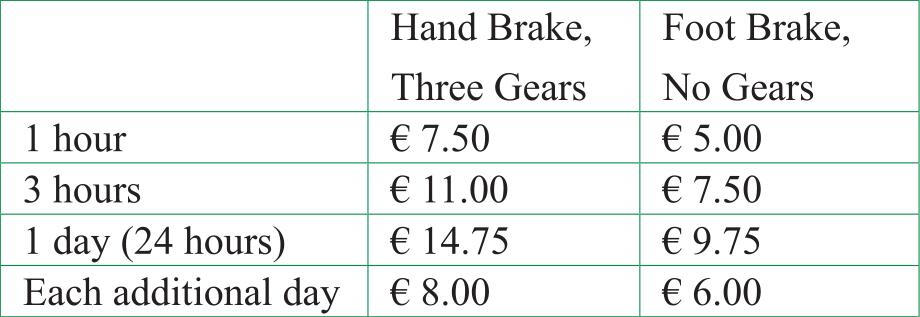 2. How much do you pay for renting a bike with hand brake and three gears for two days?
