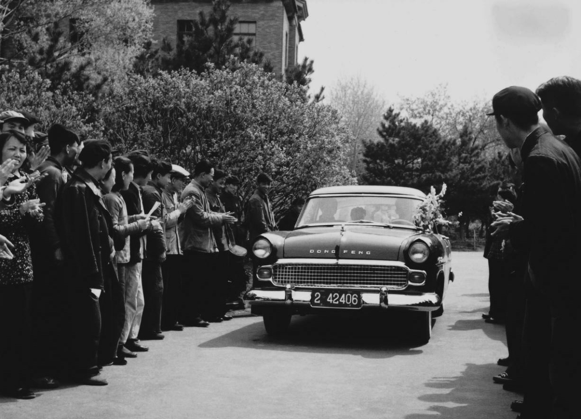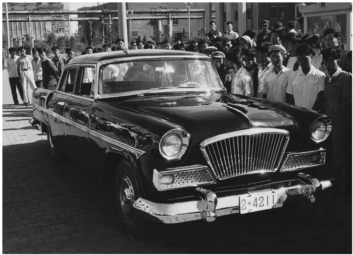 根据毛泽东同志的讲话精神,1957年4月,一机部黄敬部长到一汽检查工作时就产品开发问题进行了专门座谈,提出了试制轿车、越野车的规划。同年5月,一机部正式给一汽下达了生产小轿车的任务,提出了“愈快愈好”的要求。为了支持一汽研制轿车,周恩来、朱德等国家领导人把自己乘坐的轿车送给一汽作参考。一机部决定为一汽逐步充实技术人员和增添试验设备,每年为一汽补充大学毕业生10~20名。1957年6—8月,一汽参照捷克斯柯达轿车、苏联胜利、法国西姆卡、英国福特赛飞等样车,从实际出发,不到半年时间,完成了全部设计图纸和设计文件,进入试制阶段。1958年5月12日,代号为CA71的中国第一辆小轿车驶下了生产线,发动机最大功率为51.4千瓦,最高车速为每小时128千米,耗油量为百千米9~10升。根据毛泽东同志《在各国共产党和工人党莫斯科会议上的讲话》中的“东风压倒西风”的言论,这款轿车被命名为“东风”。同年5月21日,东风车开到中南海怀仁堂前(见图2-4),供参加党的八大二次会议代表观赏。会议休息期间,毛泽东同志来到小花园停车场,亲自参观并和林伯渠一起乘车绕花园行驶两圈,高兴地说:“坐上我们自己制造的小汽车了。”毛泽东同志看车后的第二天,刘少奇同志看车,第三天周恩来同志看车,看得很认真,问得很详细。东风轿车在京期间,深受北京市民的钟爱。
