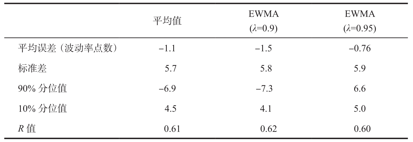 平均值的误差仅次于简单30天平均值(最简单的模型)的误差,但当我们考虑结果分散性时,平均值优于简单30天平均值。有趣的是取0.9和0.95 EWMA模型平均值也可以带来轻微的改善。如表3-2所示。
