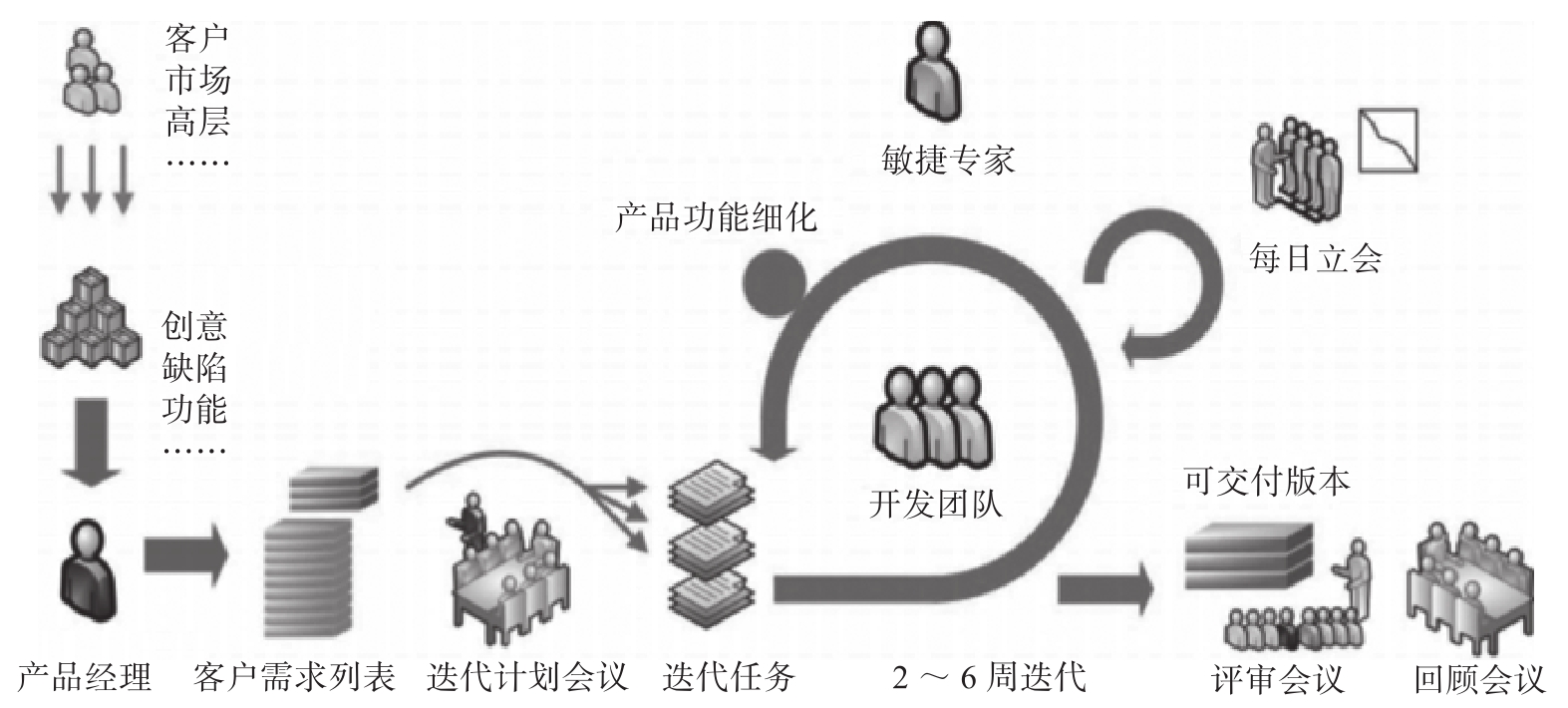 Scrum框架示意图如图2.4所示,整个开发过程由若干个迭代周期构成,每个迭代周期称为一个Sprint。Scrum通过以下过程实现产品的迭代开发:首先,产品经理根据用户需求和市场需要,提出一个按照商业价值进行排序的客户需求列表;在每个迭代的开始,开发团队要召开迭代计划会议,从这个列表中挑选出一些优先级最高的条目,形成迭代任务;在迭代开发过程中,要召开每日立会,检查每天的进展情况;在迭代结束的时候,会产生一个可运行的交付版本,由项目的相关人员参加产品的演示和评审会议,来决定该版本是否达到发布的要求。