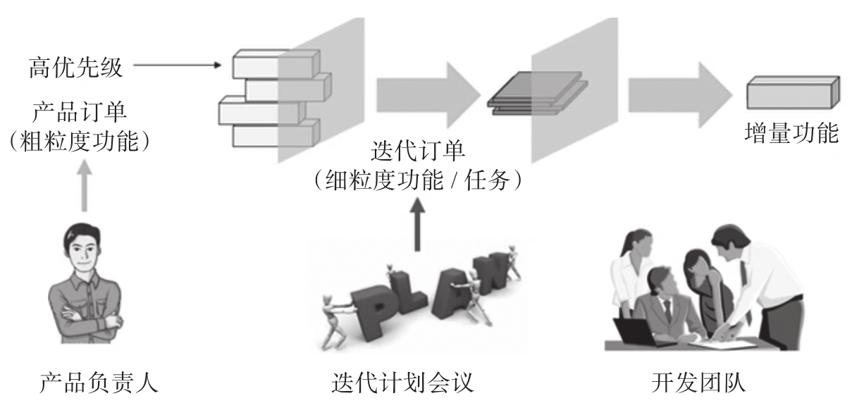 产品订单是一系列用户故事的列表。如图2.5所示,产品负责人首先确定产品订单,这是粗粒度功能,是按照优先级进行排序的;然后通过迭代计划会议得到细粒度的功能/任务,形成迭代后的订单;最后由开发团队加以实施,完成增量功能。