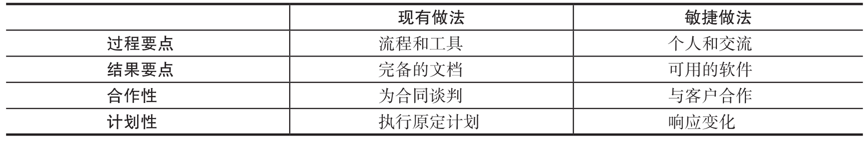从2001年开始,一些软件界的专家开始倡导“敏捷”的价值观和流程,他们在过程要点、结果要点、合作性和计划性这些方面肯定了表2.2中现有做法的价值(第2列),但是强调敏捷做法(第3列)更能带来价值。