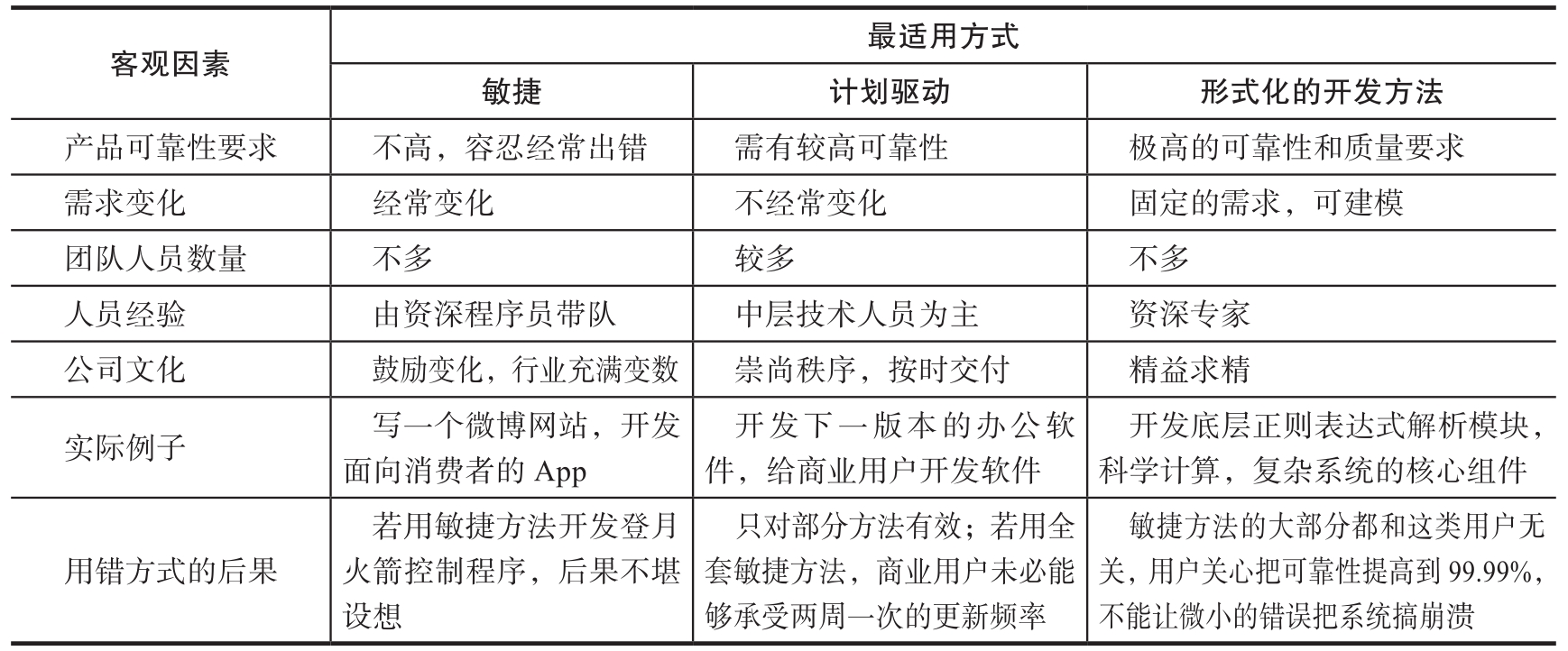 与计划驱动(plan-driven)和形式化开发方法(formal method)相比,在产品可靠性要求、需求变化、团队人员数量、人员经验、公司文化、实际例子、用错方式的后果等方面,敏捷也有自己的适用范围,具体比较情况如表2.3所示。其中,可靠性准则包括健壮性(系统承受用户无效输入的能力)、可靠性(指定操作与所观察行为之间的差别)、可用性(系统用于完成正常任务的时间)、容错性(在错误条件下系统的运行能力)、安全性(系统抵御恶意攻击的能力)、预防性(在出现错误和故障时,系统避免威胁人类生命的能力)等。