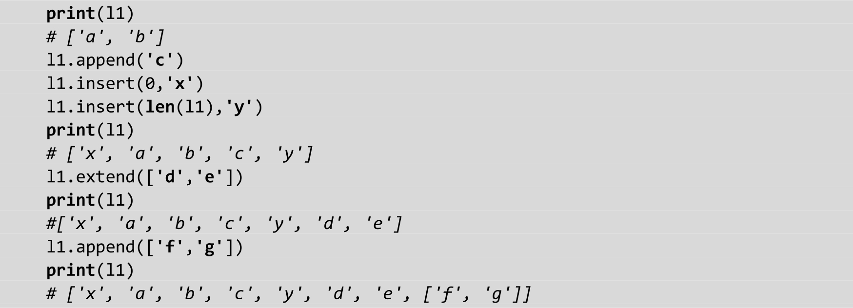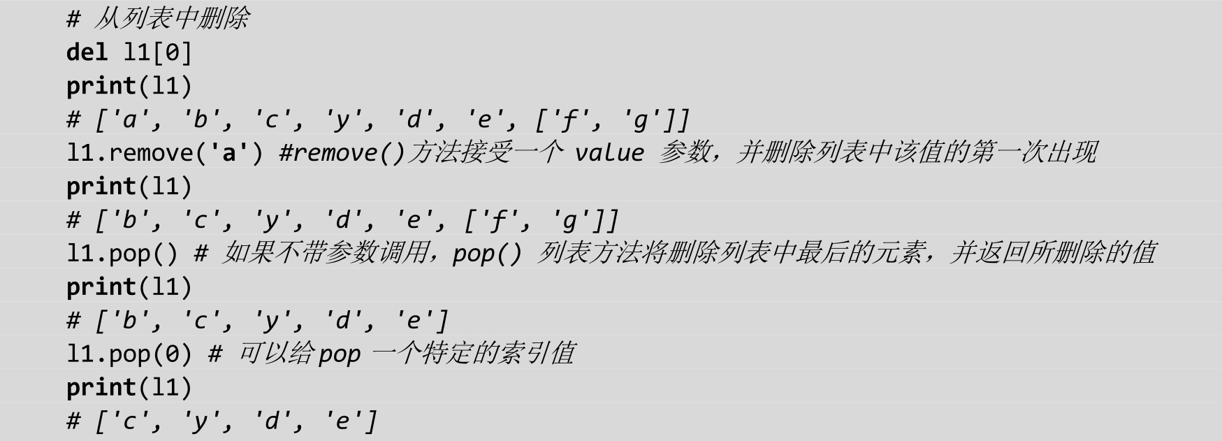 这里要注意的是extend()接受一个列表,并把其元素分别添加到原有的列表,类似“扩展”。而append()是把参数(参数有可能也是一个列表)作为一个元素整体添加到原有的列表中。insert()方法会将单个元素插入到列表中。第一个参数是列表中将插入的位置(索引)。