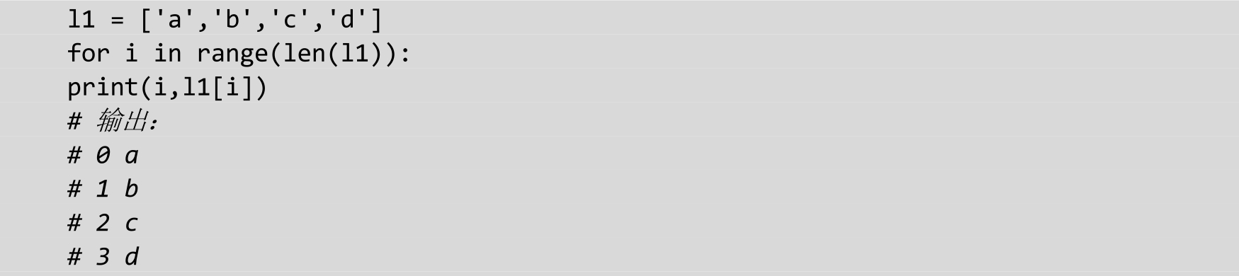 提示:如果想要输出列表中的索引和对应的元素,除了上面的方法之外,还有更符合Python风格的用法,如enumerate()方法等,有兴趣的读者可自行了解。