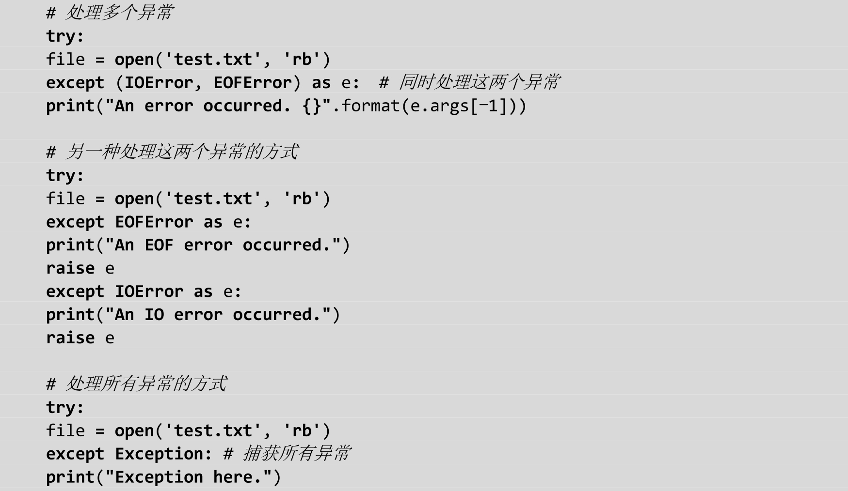异常处理语句也可以写得非常灵活,比如同时处理多个异常: