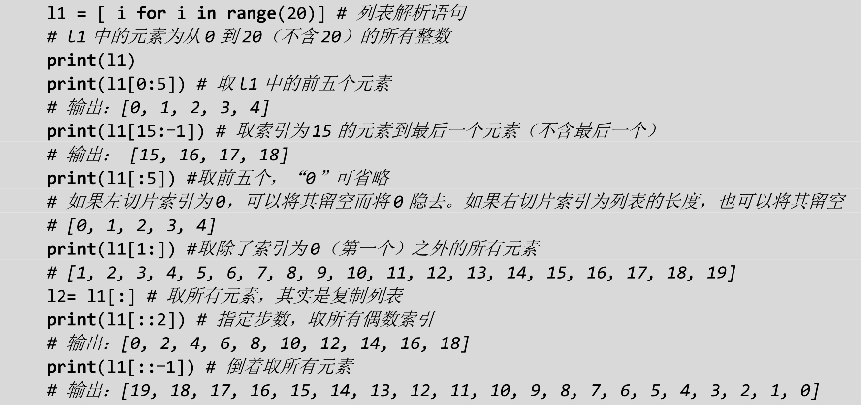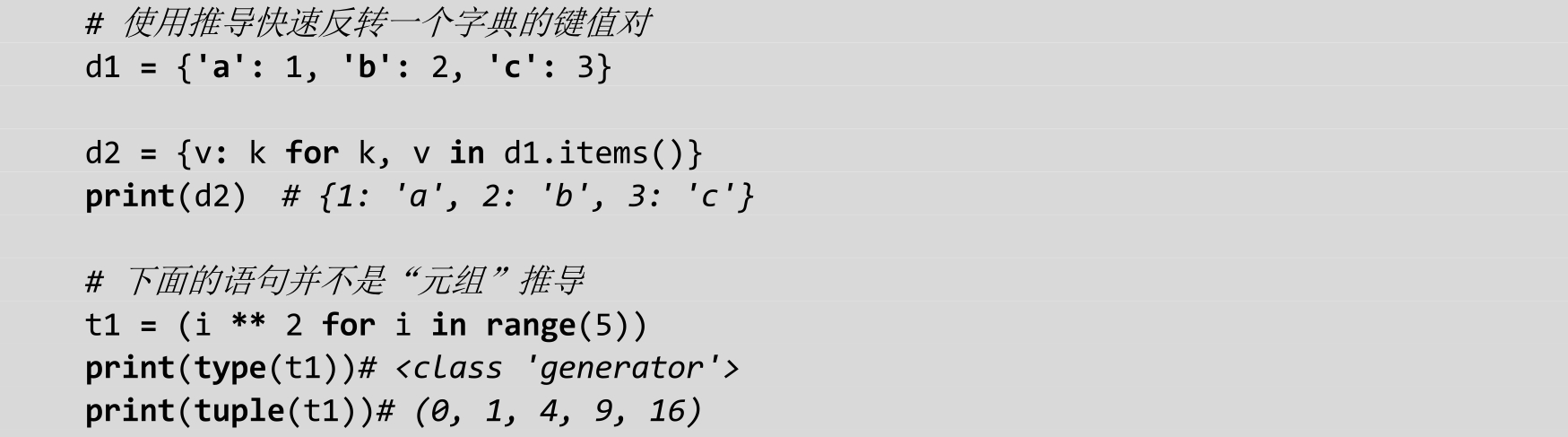 这种“推导”(解析)也适用于字典和集合。这里没有说“元组”,是因为元组的括号(圆括号)表示推导时会被Python识别为生成器,关于生成器的具体概念,可以见本书7.1.2节。一般如果需要快速构建一个元组,可以选择先进行列表推导,再使用tuple()将列表“冻结”为元组: