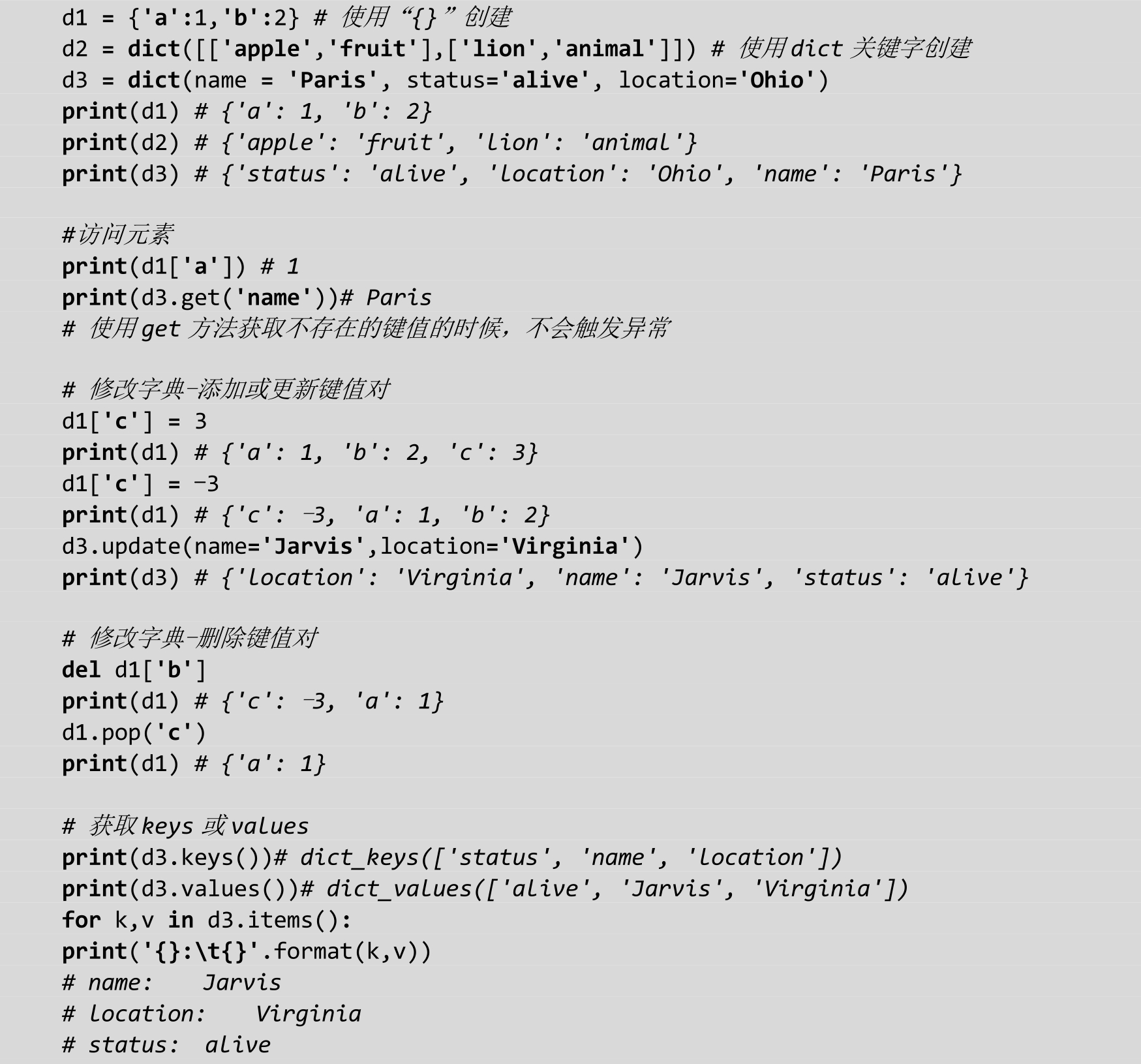 字典(Dict)相对于列表、元组和集合,会显得稍微复杂一点。Python中的字典是键值对(Key-Value)的无序集合。在形式上也和集合类似,创建字典和操作字典的基本方式如下: