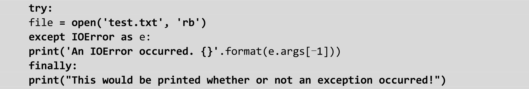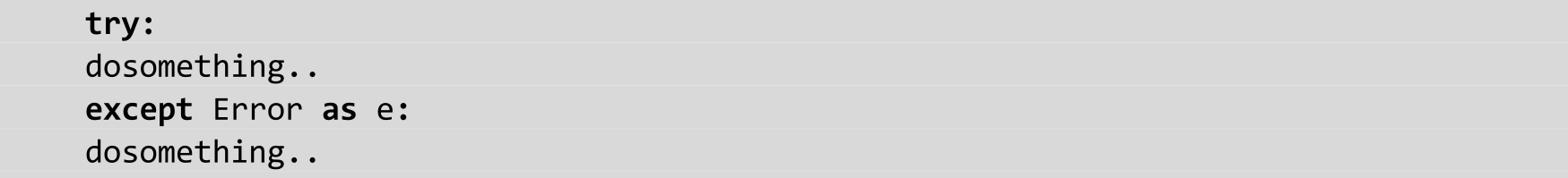 Python中的异常处理也比较简单,核心语句是try…except…结构,可能触发异常产生的代码会放到try语句块里,而处理异常的代码会在except语句块里实现:
