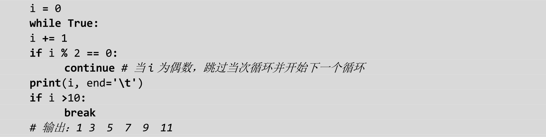 语句while_suit_codes会被连续不断地循环执行,直到表达式的值为False,接着Python会执行下一句代码。在for循环和while循环中,也会使用到break和continue关键字,分别代表终止循环和跳过当下循环开始下一次循环:
