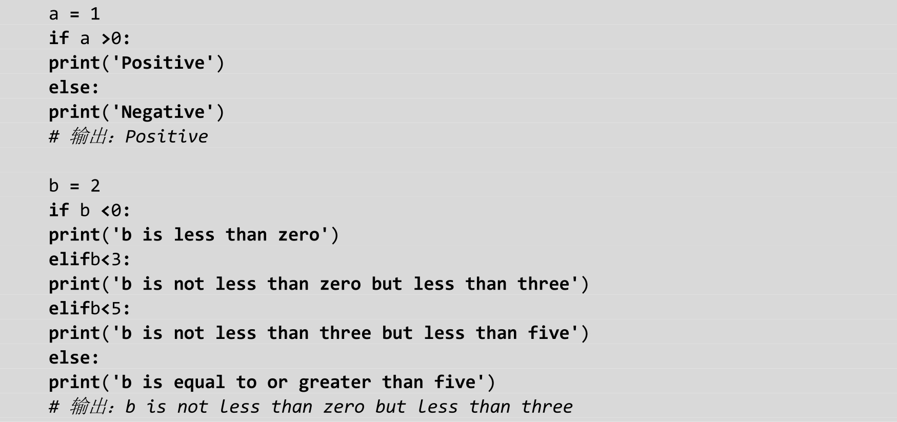 与很多其他语言一样,Python也有自己的条件语句和循环语句。不过Python中的这些表示程序结构的语句并不需要用括号(比如“{}”)括起来,而是以一个冒号作为结尾,以缩进作为语句块。if,else,elif关键词是条件选择语句的关键: