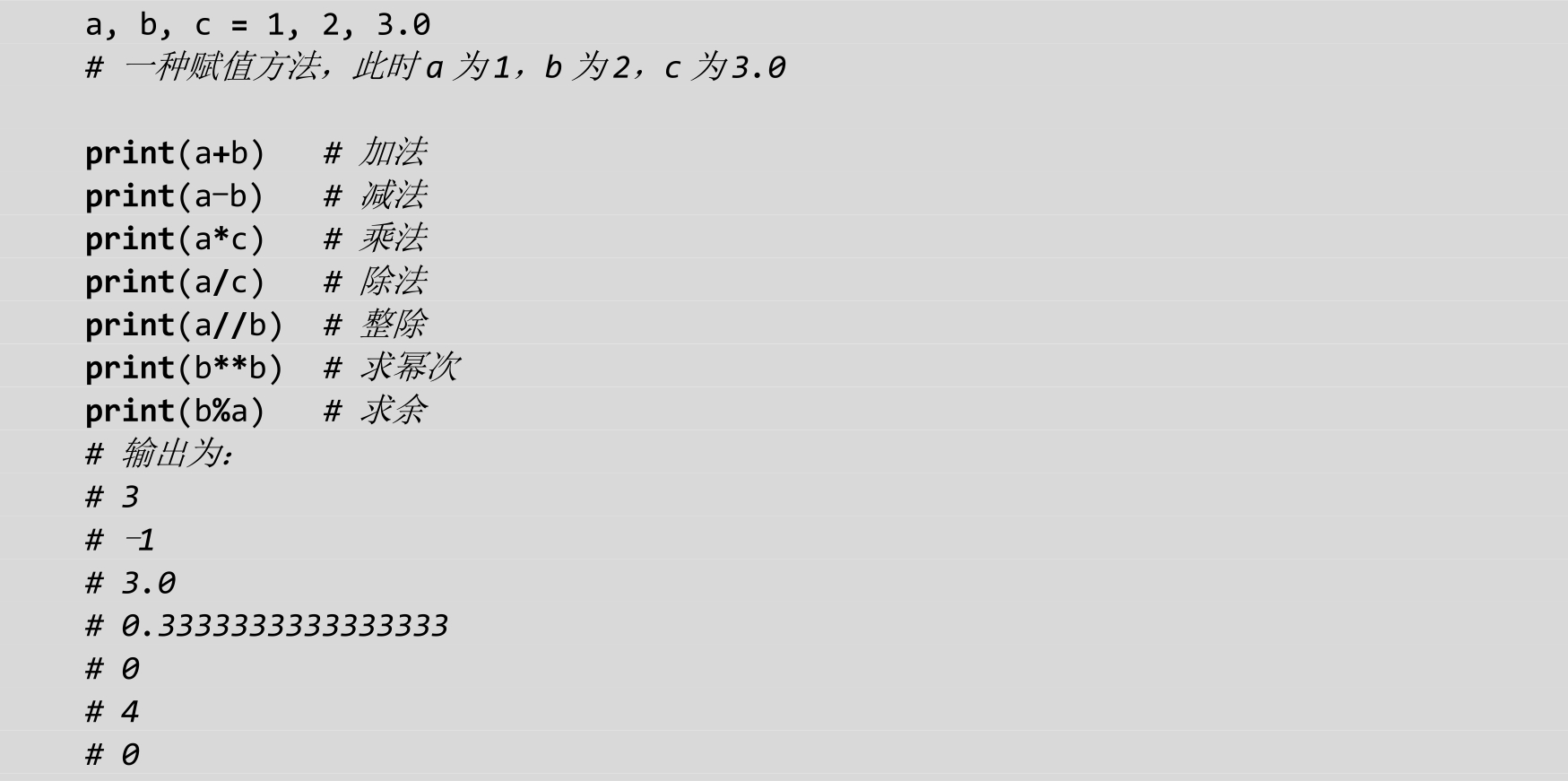 Python 2中曾有int和long(长整数类型)的区分,但在Python 3中,int吸收了Python 2.x版本中的int和long,不再对较大的整数和较小的整数做区分。有了数值,就有了数值运算:
