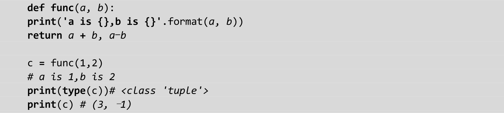 如果没有显式的return语句,函数会自动返回None。另外,也可以使函数一次返回多个值,实质上是一个元组: