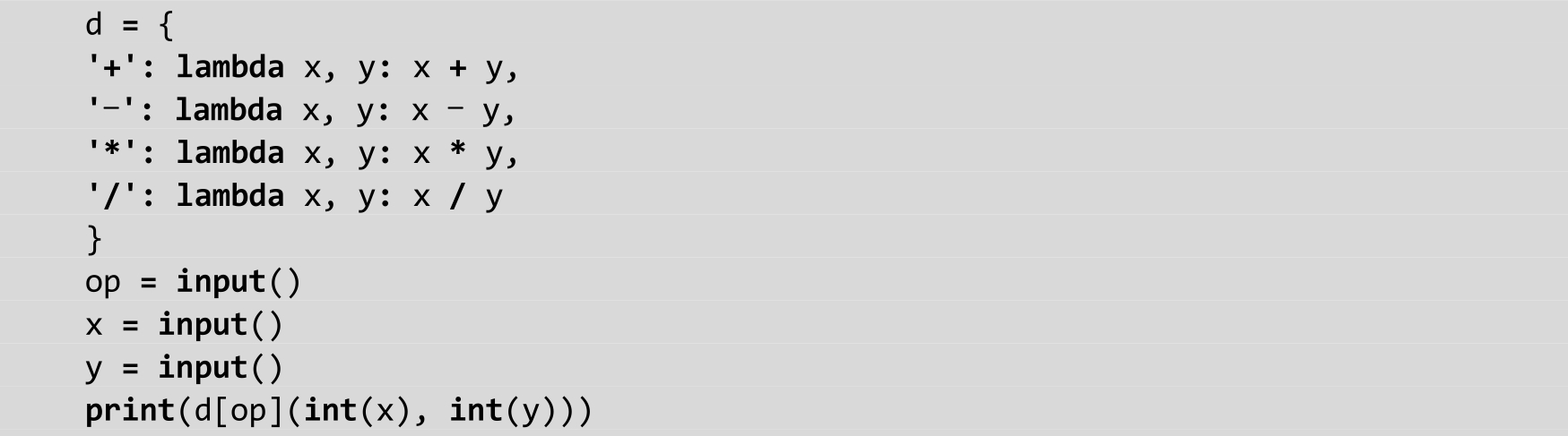 这段代码实现的功能是,输入一个运算符,再输入两个数字,返回其计算的结果。比如输入“+12”,输出“3”。这里需要说明的是,input()是读取屏幕输入的方法(在Python 2中常用的raw_input()不是一个好选择),lambda关键字代表了Python中的匿名函数,匿名函数不使用def关键字定义,其格式也与常见的def函数有所不同,匿名函数的格式为lambda args:expression,args代表了此函数接收的参数(可以有多个),expression代表此函数内部所执行的表达式,此表达式将被求值,并作为返回值返回。
