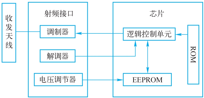 电子标签由收发天线、电压调节器、解调器、逻辑控制单元、存储器和调制器等组成,如图2-62所示。其中收发天线用于接收来自阅读器的信号,并把所要求的数据送回给阅读器;电压调节器利用阅读器发射的电磁场能量或自身电池提供的能量,经稳压电路输出为其他模块提供稳定的电源;解调器负责从接收的信号中去除载波,解调出原信号;调制器负责将逻辑控制单元所送出的数据经调制器后加载到天线并送给阅读器;逻辑控制单元对来自阅读器的信号进行译码,并根据阅读器的要求回发信号;存储器是系统运作及存放识别数据的位置。