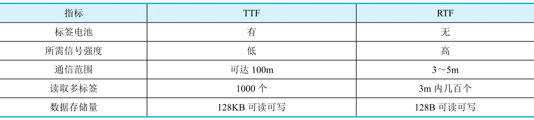 依据通信方式的不同,电子标签又可分为主动式标签(Tag Talk First,TTF)和被动式标签(Read Talk First,RTF),两者的性能对比如表2-21所示。主动式标签一般内部自带电池进行供电,它的电能充足,工作可靠性高,信号传送距离远。另外,主动式标签可以通过设计电池的不同寿命对标签的使用时间或使用次数进行限制;缺点主要是标签的使用寿命受到限制,而且随着标签内电池电力的消耗,数据传输的距离会越来越小,影响系统的正常工作;主要应用于军事和交通控制。而被动式标签具有永久的使用期,常常用在标签信息需要每天读写或频繁读写多次的地方;支持长时间的数据传输和永久性的数据存储;缺点主要是数据传输的距离要比主动式标签小;主要应用于零售行业的传统标签。
