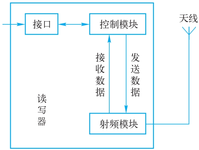 典型的RFID阅读器包含射频模块(发送器和接收器)、控制单元以及阅读器天线,如图2-64所示。其中射频模块主要负责射频信号与基带信号之间的转换和数据信息的调制解调;控制单元作为RFID阅读器的核心,主要负责与平台系统及RFID标签间的通信管理、基带信号的编解码、执行防碰撞算法、数据传送过程中的加解密、身份认证以及对外设的控制等功能;天线的功能主要是负责接收或者发送射频信号,实现数据信息和能量的传送。有时阅读器的天线是一个独立的部分,不包含在阅读器中。