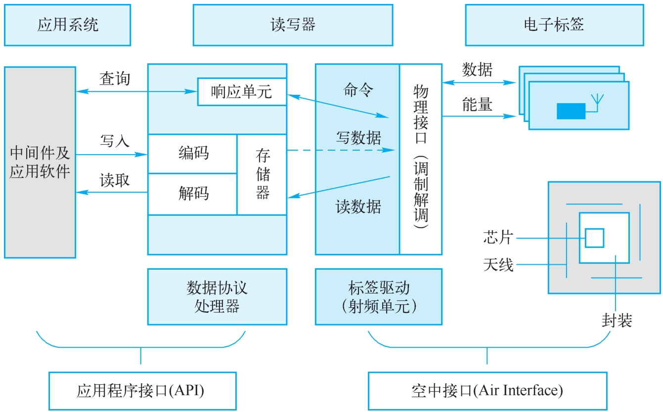射频识别系统(Radio Frequency Identification System)是在计算机技术支持下,由射频标签、识读器、计算机网络和应用程序及数据库组成的自动识别和数据采集系统。典型的RFID系统主要由阅读器、电子标签、RFID中间件和应用软件四部分构成,一般把中间件和应用软件统称为应用系统,如图2-60所示。