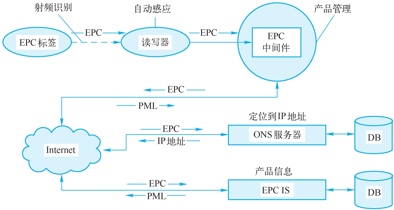 EPC信息网络系统由本地网络和全球互联网组成,是实现信息管理、信息流通的功能模块。EPC信息网络系统是在全球互联网的基础上,通过EPC中间件、ONS和EPC IS来实现全球“实物互联”。