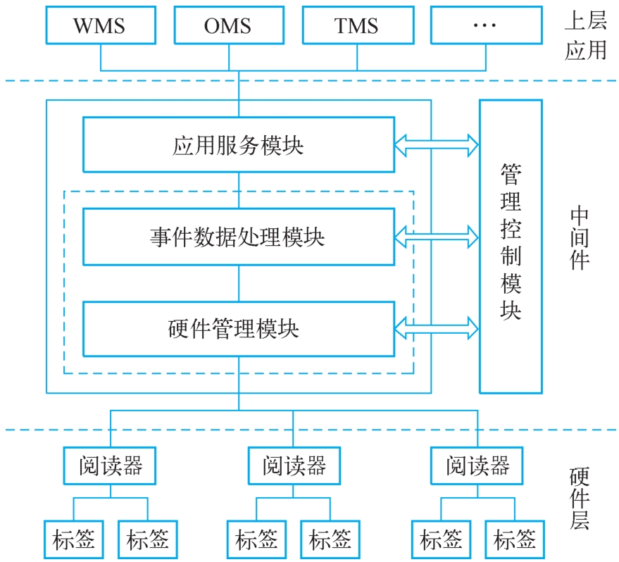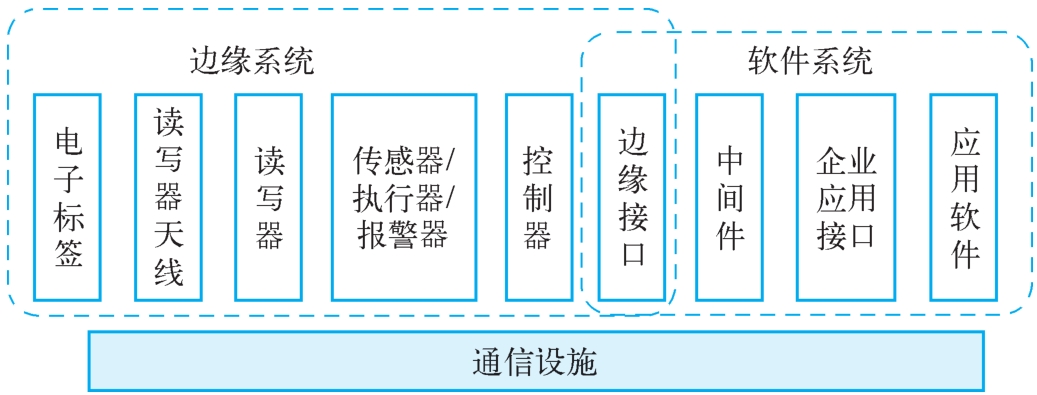 若从功能实现的角度观察,又可将RFID系统分成边缘系统和软件系统两大部分。这种观点同现代信息技术观点相吻合。边缘系统主要是完成信息感知,属于硬件组件部分。软件系统完成信息的处理和应用,属于软件组件部分。软件系统独立于硬件组件之上,包括边沿接口、中间件、企业应用接口和应用软件等。其中,中间件是为实现所采集信息的传递与分发而开发的软件;企业应用接口,即为企业前端软件,如设备供应商提供的系统演示软件、驱动软件、接口软件、集成商或者客户自行开发的RFID前端软件等;应用软件主要指企业后端软件,如后台应用软件、管理信息系统(MIS)软件等。
