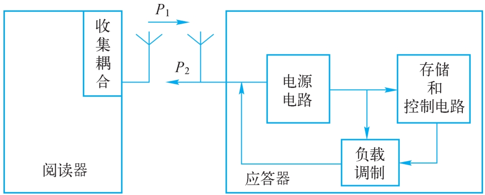 RFID反向散射耦合方式的原理如图2-59所示。图中的读写器、应答器(电子标签)和天线构成了一个收发通信系统。电子标签接收读写器发射的信号,其中包括已调制载波和未调制载波。当标签接收的信号没有被调制时,载波能量全部被转换成直流电压,为电子标签内的芯片提供能量;当载波携带数据或者命令时,电子标签通过接收电磁波作为自己的能量来源,并对接收信号进行处理,从而接收读写器的指令或数据。电子标签向读写器返回信号时,读写器只向标签发送未调制载波,载波能量一部分被电子标签转化成直流电压,供给电子标签工作;另一部分被标签通过改变射频前端电路的阻抗调制并反射载波来向读写器传送信息。