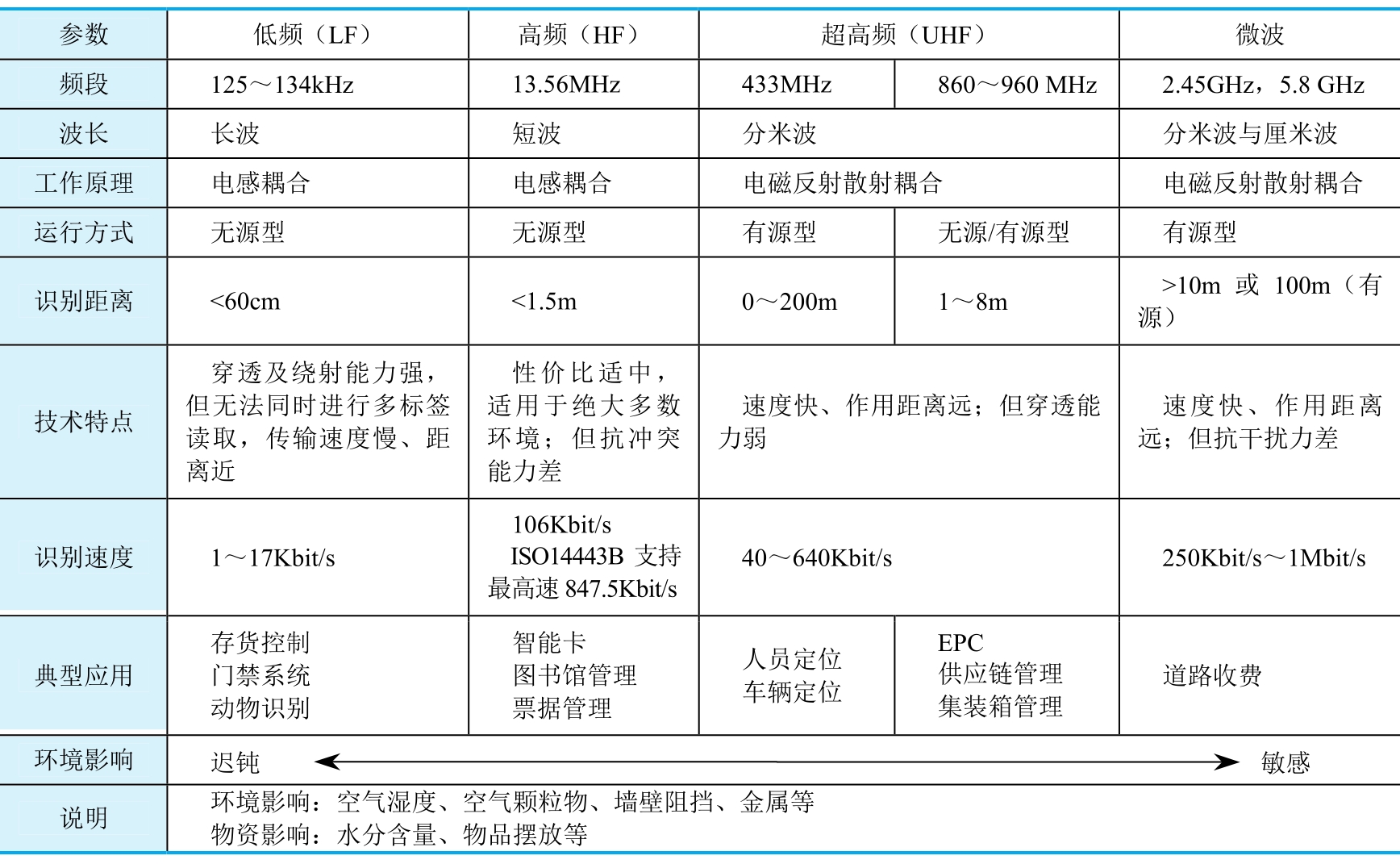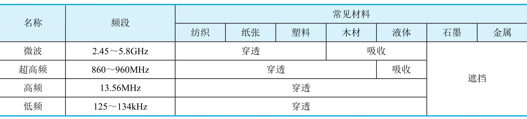 RFID各频段的技术参数及常见材料穿透能力如表2-18和表2-19所示。