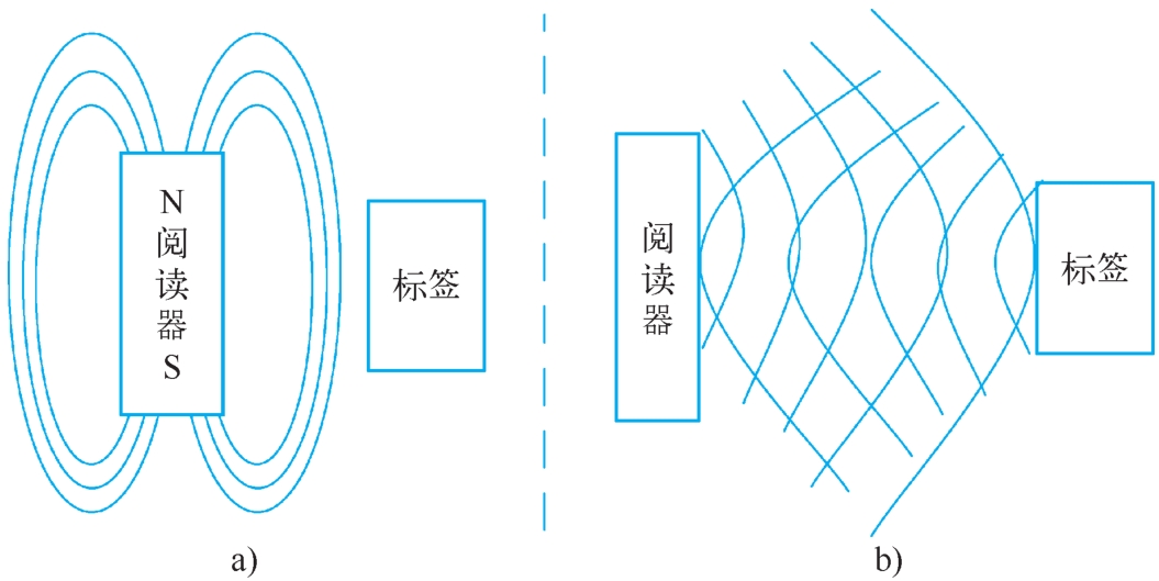 RFID的基本工作原理并不复杂。标签靠近阅读器后,接收阅读器发出的射频信号,凭借感应电流所获得的能量发送出存储在芯片中的信息,或者由标签主动发送某一频率的信号,阅读器读取信息并解码后,送至中央信息系统进行有关数据处理。从电子标签到阅读器之间的通信及能量感应方式来看,其交互方式可以分成电感耦合(Inductive Coupling)和电磁反向散射耦合(Backscatter Coupling)两种,如图2-57所示。