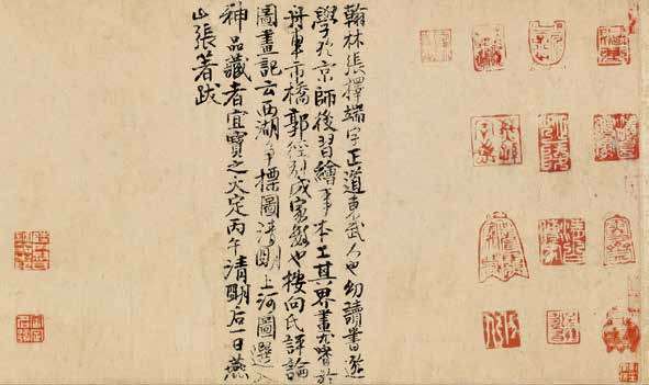 身在金国的张著写下了这段话:“翰林张择端,字正道,东武人也。幼读书,游学于京师,后习绘事。本工其界画,尤嗜于舟车、市桥郭径,别成家数也。按向氏《评论图画记》云:《西湖争标图》《清明上河图》选入神品,藏者宜宝之。大定丙午,清明后一日,燕山张著跋。”张著在金朝负责监管御府书画,能力和视野显然是不容怀疑的,所以张著得到的信息应该是比较可靠的。