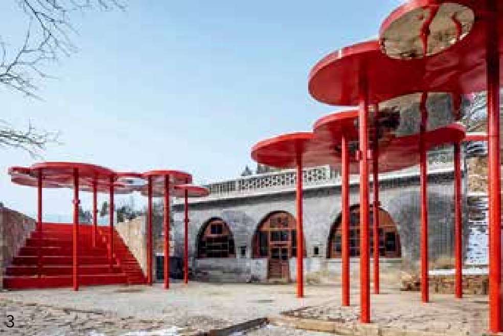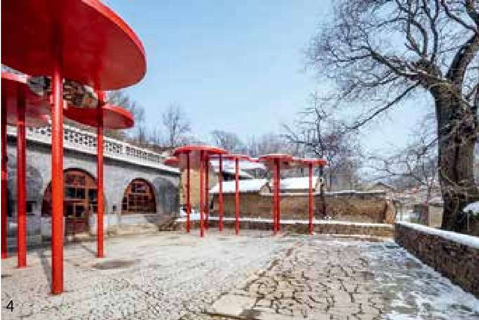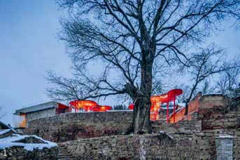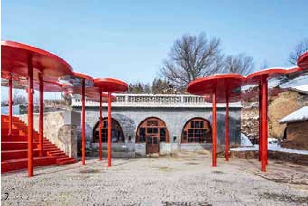 山西沁源县韩洪沟老村有棵百年大槐树,如同神灵般守护着村庄。大槐树下一直是村民集会的地方,以前是村里重要的公共空间,也是体现村庄精神之地。通过增加红色艺术装置,将窑洞与大槐树一起对场地进行围合,成为乡村记忆馆和小剧场。看台斜向楼板下的室内空间设计了一个下沉式剧场,可以播放影像,与户外看台功能互补,满足了北方地区冬季的室内活动需求(图片来源:金伟琦、何葳)