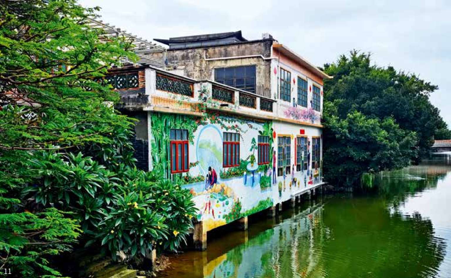 沿着村边的河涌水口林,民居外墙彩绘了民俗画