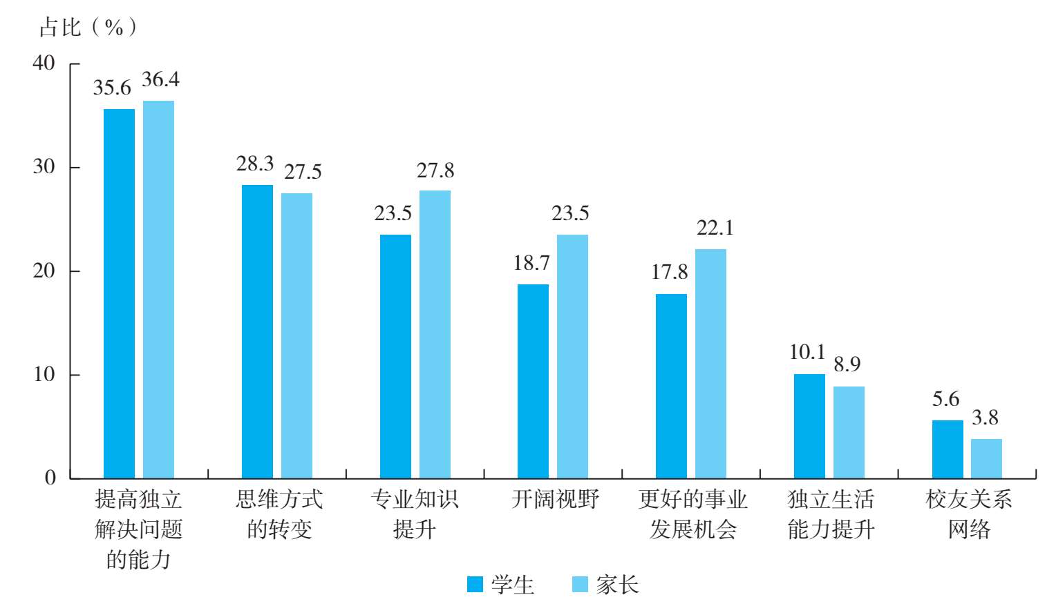 在家长群体看来,提高独立解决问题的能力(36.4%)是留学带给孩子的最大收获(见图1-72),这表明家长高度重视孩子在留学期间独立思考和解决问题的能力的提升。同时,家长也认可留学带给孩子的思维方式的转变(27.5%)和专业知识提升(27.8%)。2022年,家长群体认为提高独立解决问题的能力(34.4%)、思维方式的转变(18.8%)和专业知识提升(18.5%)是孩子留学后的最大收获。2020年,家长群体认为提高独立解决问题的能力(23.8%)和专业知识提升(13.6%)是孩子留学后的最大收获。可见,家长始终关注留学经历对孩子独立解决问题的能力和自我成长产生的积极作用。