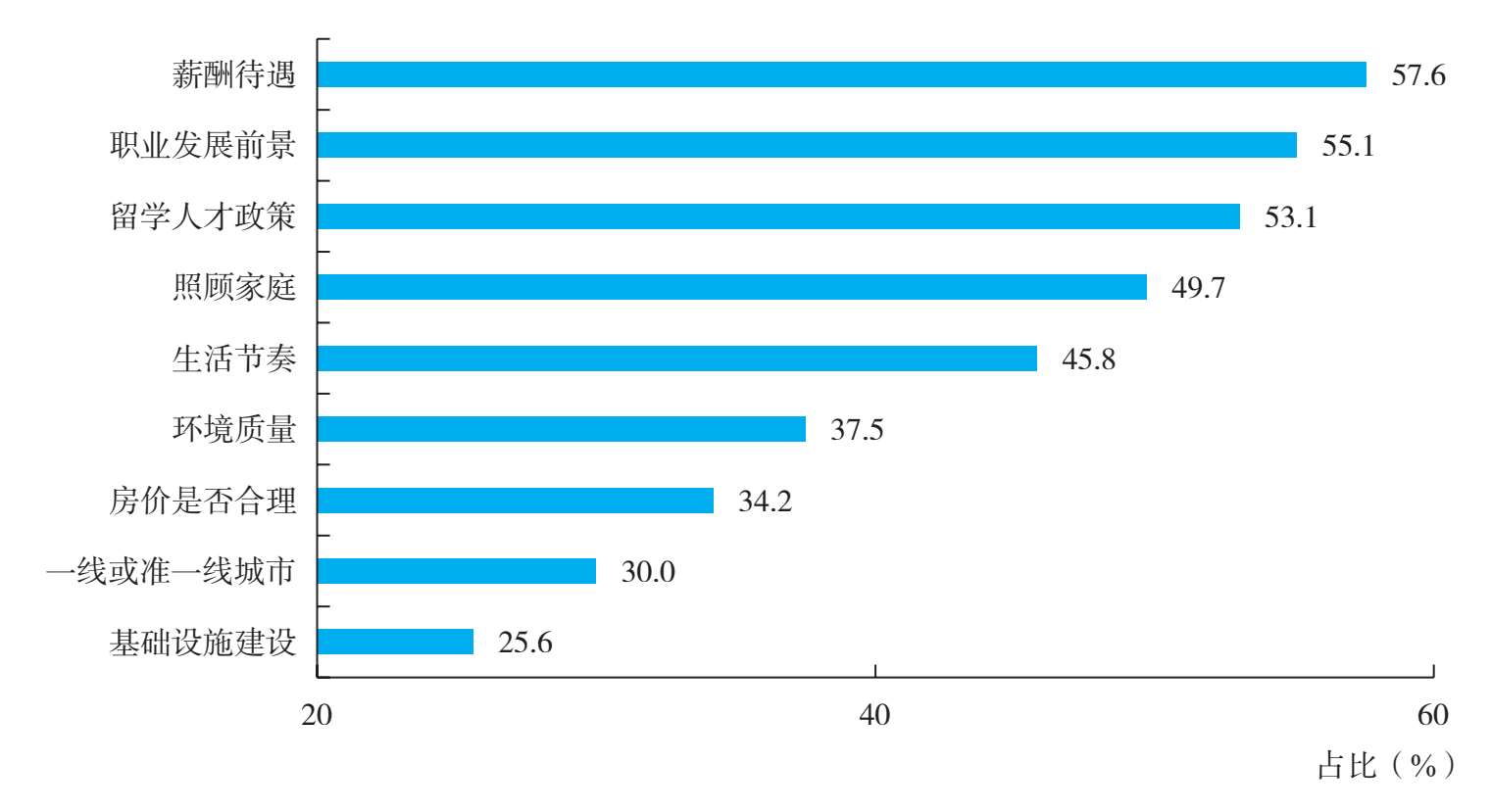 薪酬待遇和职业发展前景是海归选择就业城市时考虑的主要因素。2023年智联招聘发布的《2022年中国海归就业调查报告》显示,2022年海归群体前往新一线城市、二线城市和三线及以下城市发展的意愿均有所提升,占比分别为31.0%、15.7%和14.3%,均高于2021年的占比。由于新一线城市、二线城市和三线及以下城市陆续推出“抢人”政策,发展潜力大,同时房价较低,生活便利度也不亚于一线城市,因此越来越多海归以实际行动加速“下沉”。2023年的调研数据显示(见图1-82),薪酬待遇(57.6%)是海归人群在选择就业城市时考虑的最重要因素。此外,职业发展前景(55.1%)、留学人才政策(53.1%)和照顾家庭(49.7%)也是其关心的重要因素。可见,大部分留学生在归国后会从更多维的角度对就业城市进行衡量并加以选择。