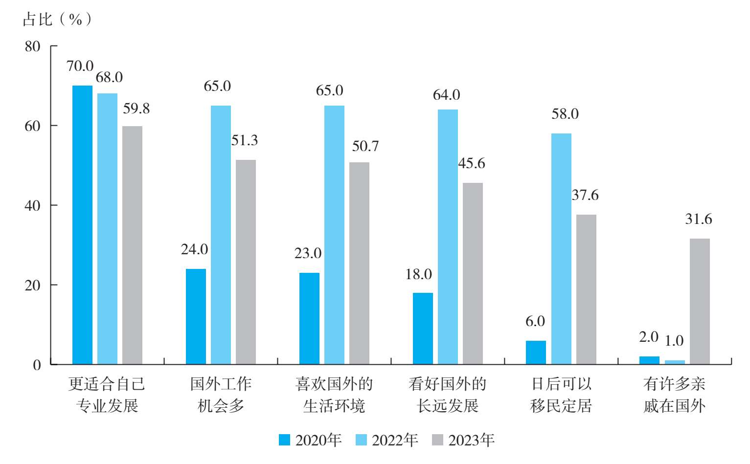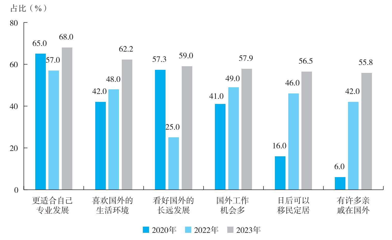 2023年的调研数据显示,“更适合自己专业发展”一直是留学生和家长群体选择留在国外发展的主要因素,这与往年(2020年和2022年)调研数据显示的结果相吻合(见图1-75和图1-76)。相比于往年,2023年,因为“更适合自己专业发展”和“喜欢国外的生活环境”而留在国外的留学生比例均有所上升。同时,在留学生群体中,“日后可以移民定居”和“有许多亲戚在国外”也成为其做出留在国外发展的决策时十分重要的考虑因素。在家长群体中,“有许多亲戚在国外”同样成为十分重要的考虑因素。