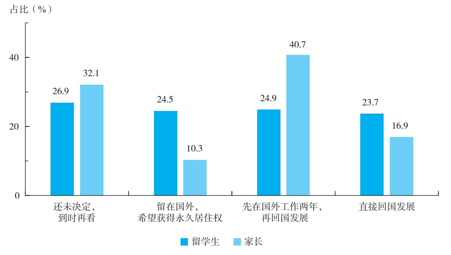 2022年的调研数据显示(见图1-74),有48.6%的留学生有回国发展的打算,其中“直接回国发展”的留学生占全部受访留学生的23.7%,“先在国外工作两年,再回国发展”的留学生占24.9%,而“留在国外,希望获得永久居住权”的留学生占24.5%。在家长群体中,有57.6%的家长希望孩子回国发展,其中希望孩子“直接回国发展”的家长占全部留学生家长的16.9%,希望孩子“先在国外工作两年,再回国发展”的家长占40.7%,而希望孩子“留在国外,希望获得永久居住权”的家长占10.3%。