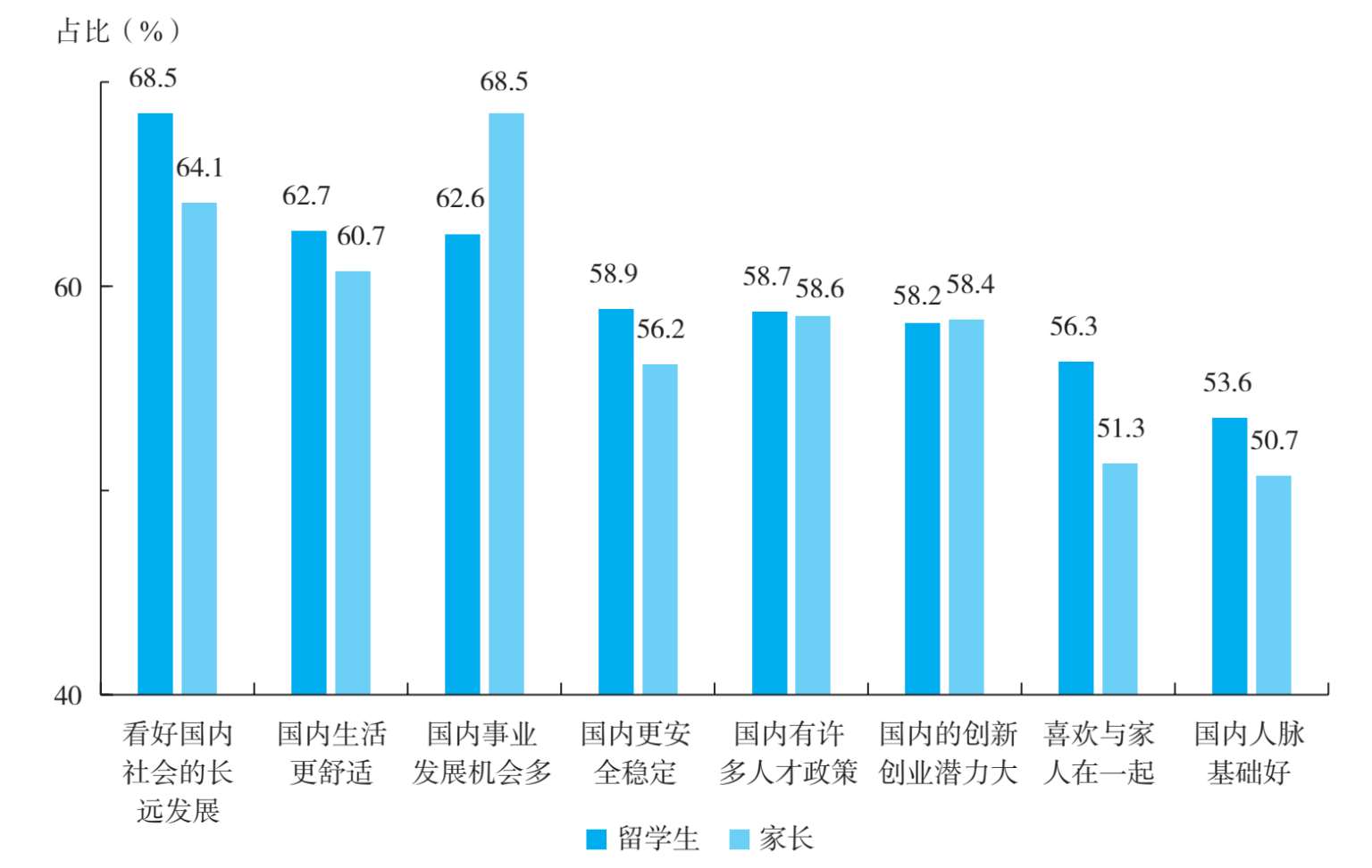 兼顾事业发展与照顾家庭是留学生选择回国发展的主要原因。2023年,智联招聘发布的《2022年中国海归就业调查报告》显示:自2020年以来,在国内求职的海归数量明显增长;与2021年相比,2022年应届留学生规模同比增长8.6%。报告还显示,近几年来,国内海归的薪酬持续走高,从海归优先职位平均招聘薪酬与全平台平均月薪对比来看,海归优先职位的平均招聘薪酬连续三年走高,2020—2022年呈阶梯式上涨。2022年海归优先职位的人均薪资为14 680元/月,比2021年增长了7%。整体看来,海归的薪酬优势明显,尤其是在高薪领域,例如,在50万元以上收入群体中,有留学背景的人才显著多于无留学背景的人才,前者约为后者的2倍。除了薪酬待遇上的优厚福利,留学生群体及其家长群体在做出回国发展这一决策时,还会考虑哪些因素呢?
