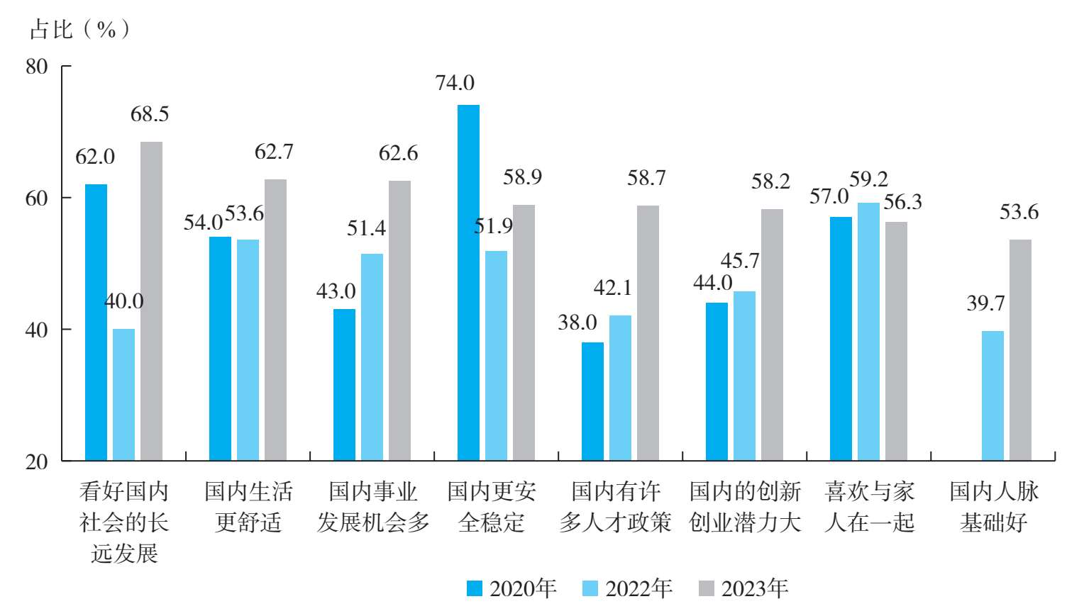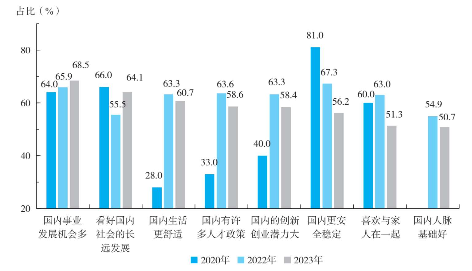 智联招聘发布的报告显示,对于回国发展这一决策,排名前三的考虑因素是“国内生活更加便利”、“更认同国内的文化环境”和“国内就业机会多”。这与2023年的调研结果基本吻合。2023年的调研结果显示(见图1-79),对于决定回国发展的留学生及其家长来说,“看好国内社会的长远发展”、“国内生活更舒适”和“国内事业发展机会多”均在其考虑的前三个重要因素之中,相比而言,家长群体对“国内事业发展机会多”这一因素的重视程度高于留学生群体。2020年,“国内更安全稳定”是81.0%的家长和74.0%的留学生选择毕业后回国发展的首要考虑因素(见图1-80和图1-81)。2022年,“喜欢与家人在一起”(59.2%)和“国内更安全稳定”(67.3%)分别是留学生和家长选择毕业后回国发展的首要原因。这与2020年以来全球出现的特殊公共健康安全问题有着十分密切的关系,相比于国外,国内安定的社会环境对留学生有着很大的吸引力。