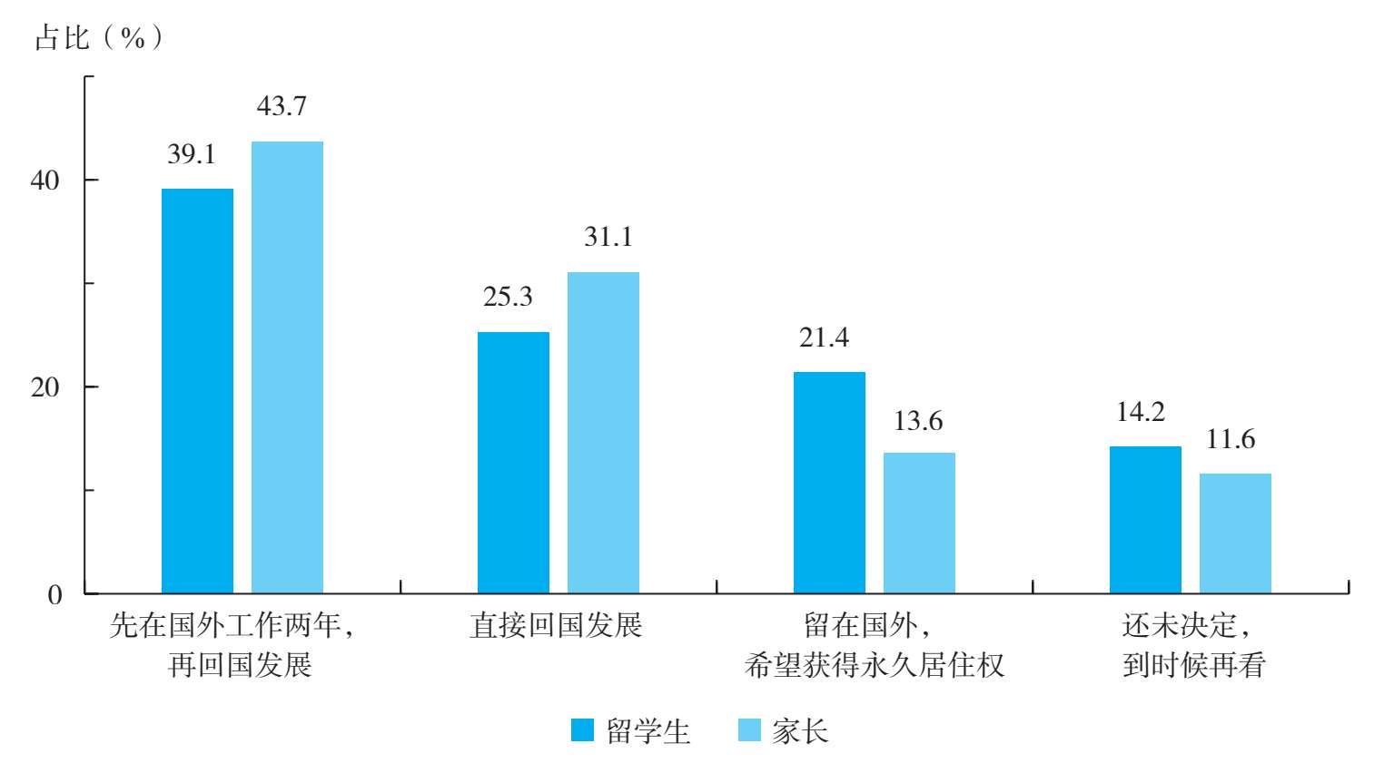 2023年的调研数据显示(见图1-73),有64.4%的留学生有回国发展的打算,其中“直接回国发展”的留学生占全部受访留学生的25.3%,“先在国外工作两年,再回国发展”的留学生占39.1%,而“留在国外,希望获得永久居住权”的留学生占21.4%。在家长群体中,有高达74.8%的家长希望孩子回国发展,其中希望孩子“直接回国发展”的家长占全部留学生家长的31.1%,希望孩子“先在国外工作两年,再回国发展”的家长占43.7%,而希望孩子“留在国外,希望获得永久居住权”的家长占13.6%。
