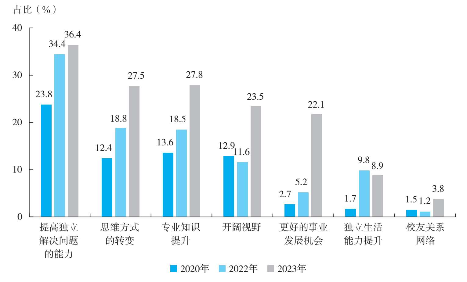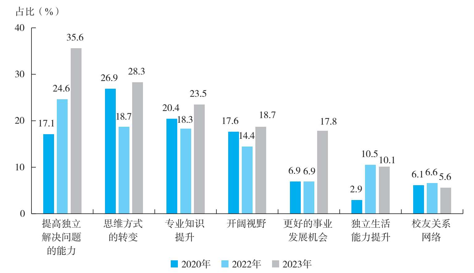 将三年的调查数据进行比对(见图1-71),可以看到,2023年,学生群体普遍认为,在留学过程中的最大收获是提高独立解决问题的能力(35.6%)、思维方式的转变(28.3%)、专业知识提升(23.5%)和开阔视野(18.7%)。2022年,学生群体普遍认为,在留学过程中的最大收获是提高独立解决问题的能力(24.6%)、思维方式的转变(18.7%)、专业知识提升(18.3%)和开阔视野(14.4%)。2020年,思维方式的转变(26.9%)、专业知识提升(20.4%)、开阔视野(17.6%)和提高独立解决问题的能力(17.1%)是学生群体认为在留学过程中的最大收获。纵观三年数据,提高独立解决问题的能力越来越成为学生群体在留学过程中的最大收获,更好的事业发展机会也日益成为留学经历为学生群体带来的重要收获。