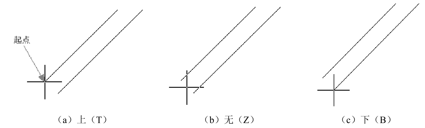 “对正”功能用于设置多线的对正方式,AutoCAD共提供了3种对正方式,即上对正、下对正和中心对正,如图3-11所示。如果当前多线的对正方式不符合用户要求,可在命令行中输入J,并按↵键,执行“对正”命令。在命令行“输入对正类型 [上(T)/无(Z)/下(B)]<上>:”提示下,用户输入多线的对正方式。