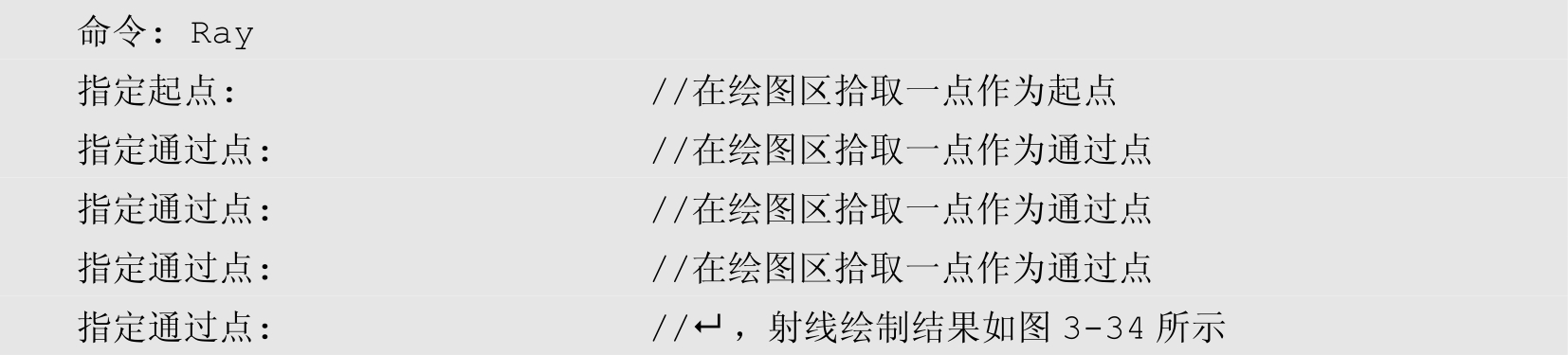 射线也是一种常用的作图辅助线,执行“射线”命令可以绘制向一端无限延伸的辅助线,如图3-34所示。执行“射线”命令主要有以下几种方式。