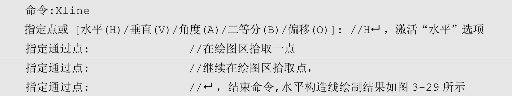 在功能区单击“默认”→“绘图”→“构造线”按钮,绘制水平构造线,命令行操作如下。