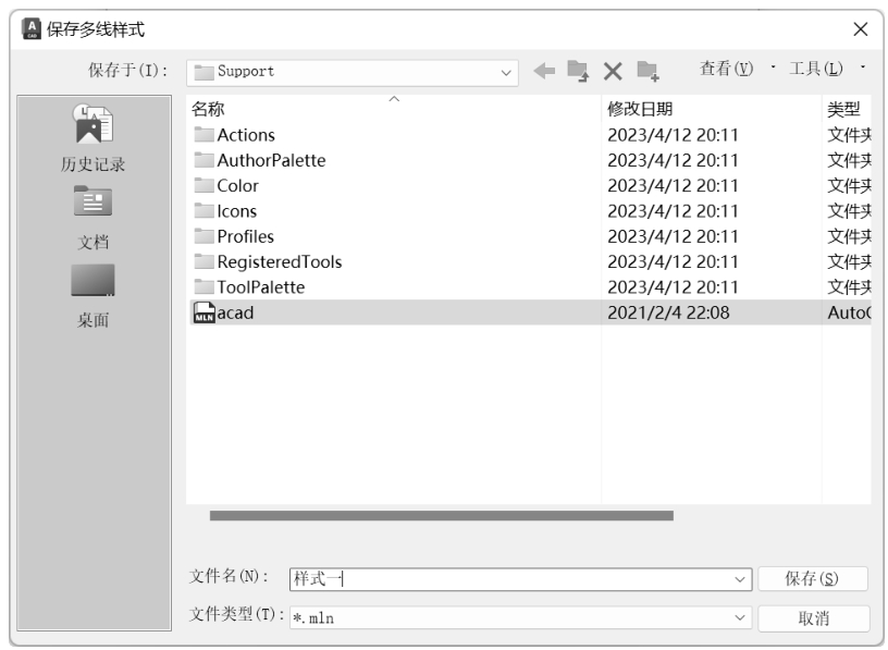 按钮,在弹出的“保存多线样式”对话框中设置文件名,如图3-20所示。将线型的新样式以“*mln”的格式进行保存,以方便在其他文件中进行重复使用。