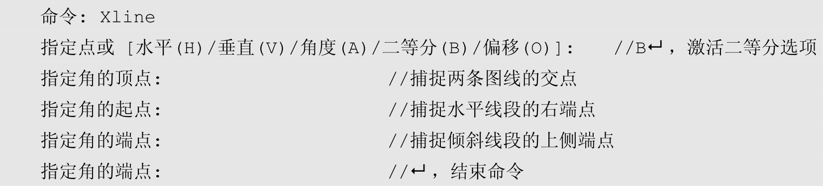 使用“构造线”命令中的“二等分”选项,可以绘制任意角度的角平分线,命令行操作如下。