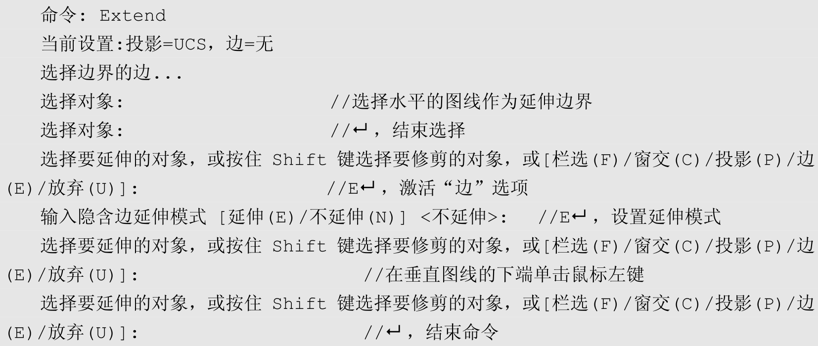 AutoCAD为用户提供了两种模式,即延伸模式和不延伸模式,系统默认模式为不延伸模式。下面通过具体实例,来学习不延伸模式下的延伸过程。