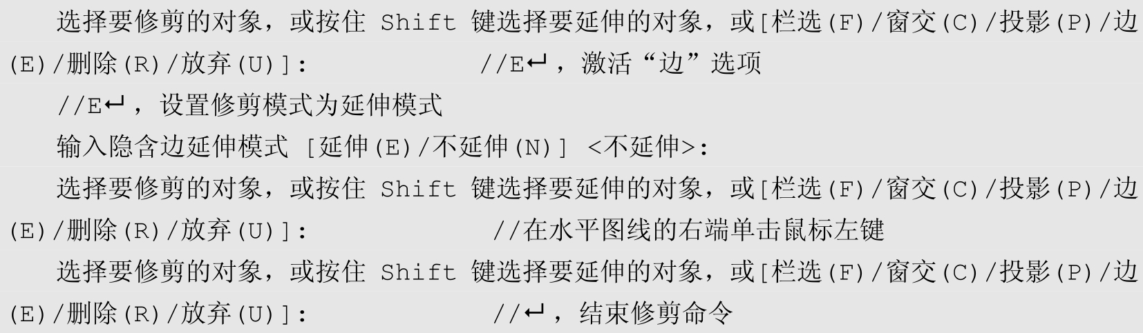 “边”选项用于确定修剪边的隐含延伸模式,其中“延伸”选项表示修剪边界可以无限延长,边界与被剪实体不必相交;“不延伸”选项指修剪边界只有与被剪实体相交时才有效。