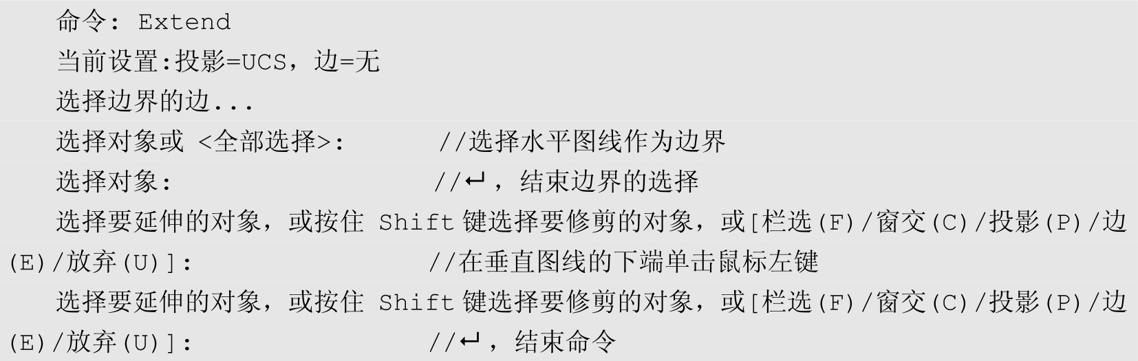 在功能区单击“默认”→“修改”→“延伸”按钮,对垂直图线进行延伸,使之与水平图线垂直相交。