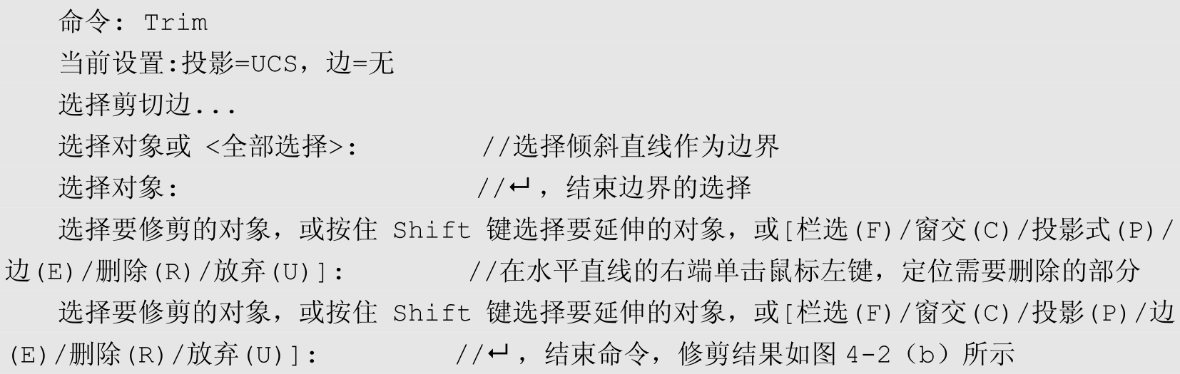 在功能区单击“默认”→“修改”→“修剪”按钮,对水平图线进行修剪。